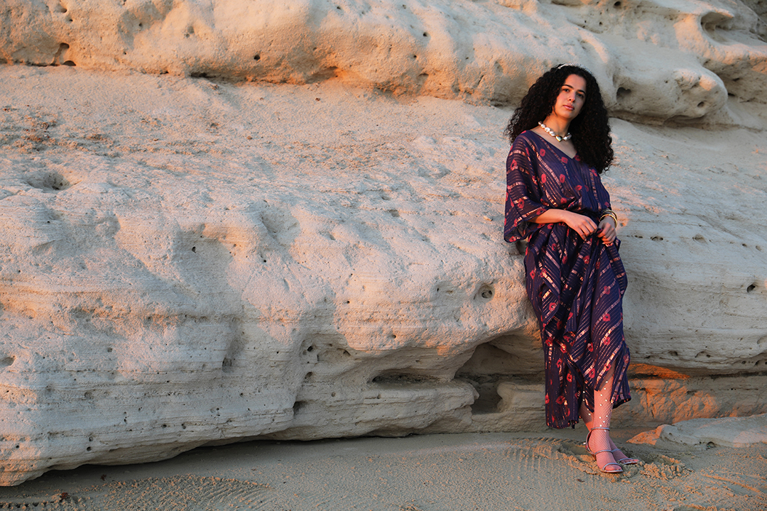 To do the clothing justice, Noor scouted a beautiful location on a secluded Kuwaiti beach. She and Shaikha AlQatami decided to reference the glamour of the disco era for the shoot. The result was bright and bold images to showcase the collection.