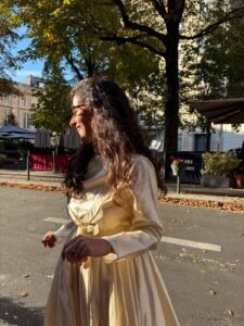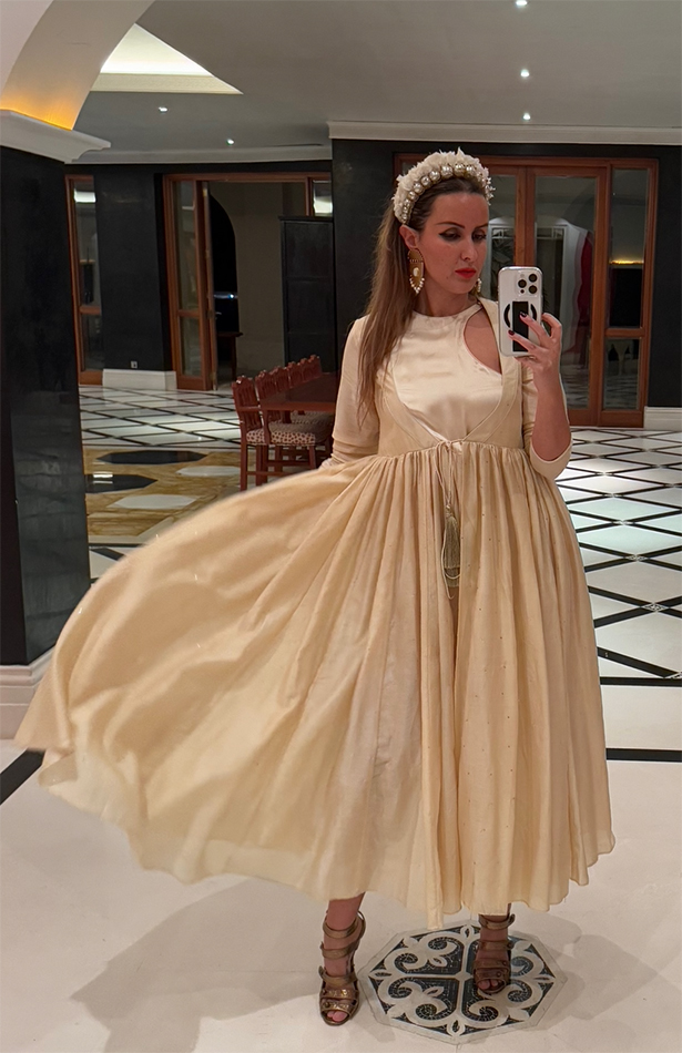 When we launched it for noon collection 2025, we chose a frothy fabric for the fullness of the skirt and we subtly studded the piece with metallic notes for even more luxury. The gentle ties on the side of the garment allows for a perfect fit across the bust. I wore this piece at an event in Kuwait, and truly felt like a Queen. We even had an extremely close friend who wore this same beautiful garment to her wedding. Nothing could have honored us more.