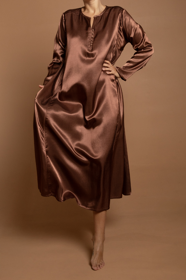 Our classic flared dishdasha with three small buttons. Made in a Gajji silk and hand dyed for us in a cappuccino color.