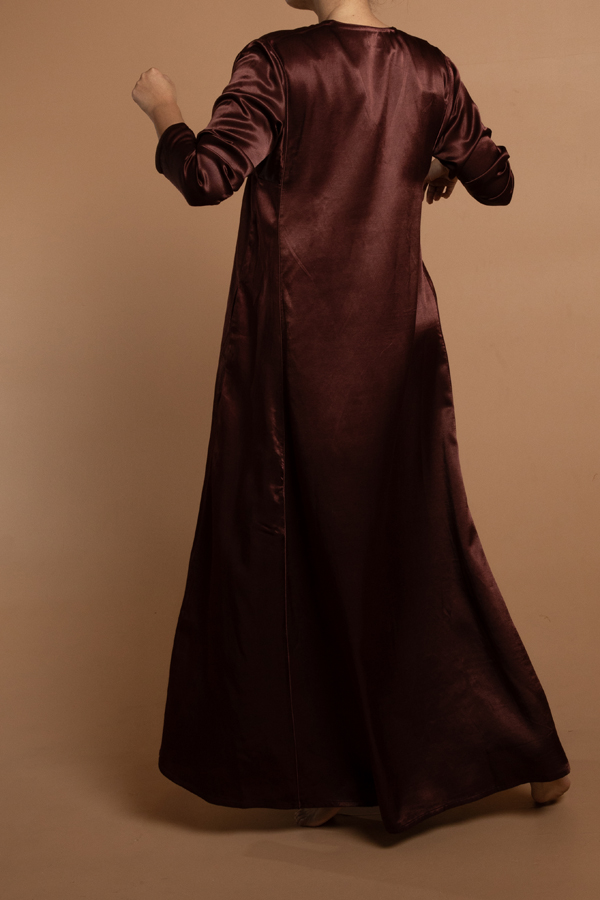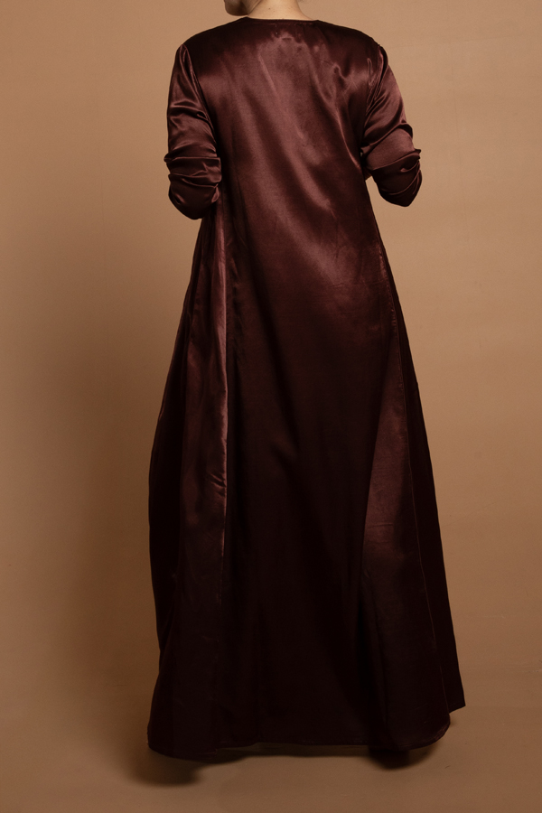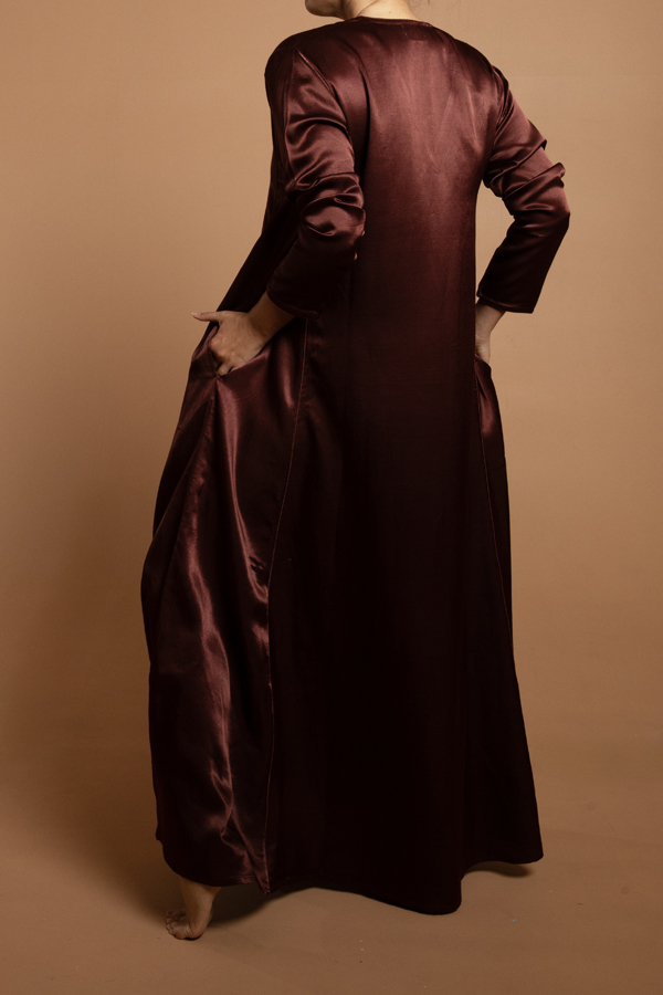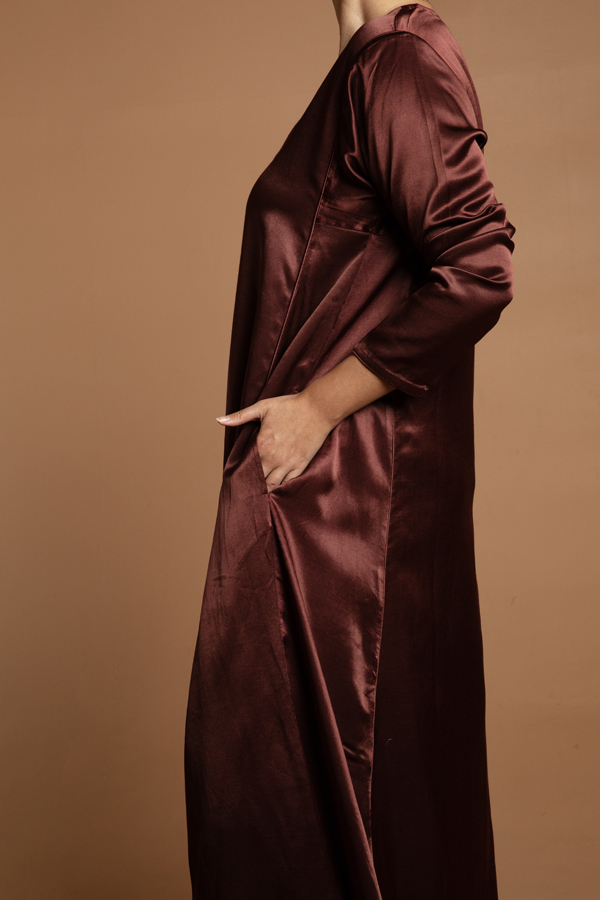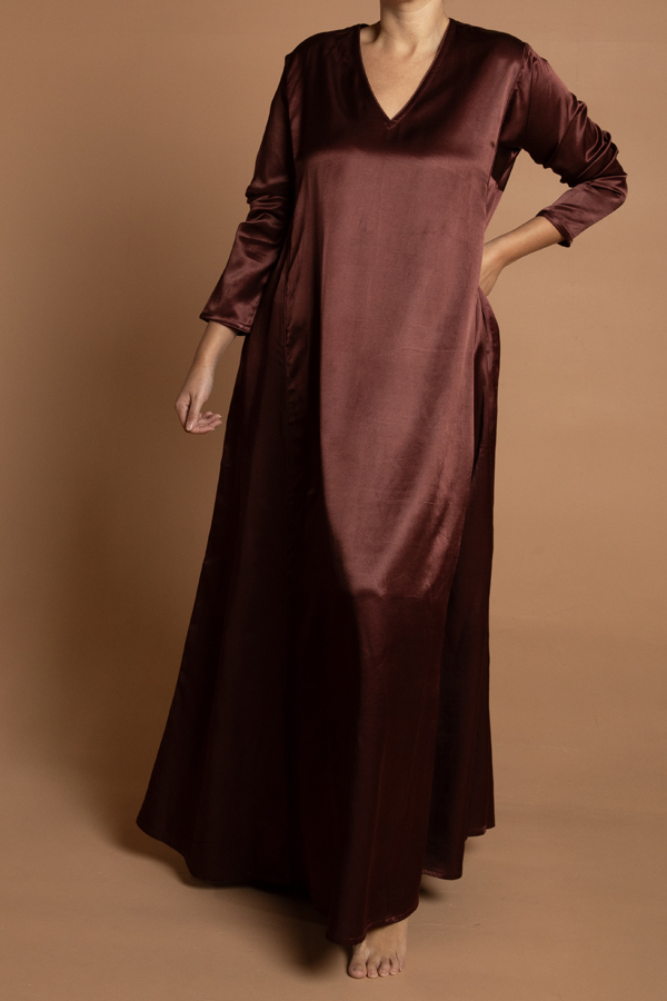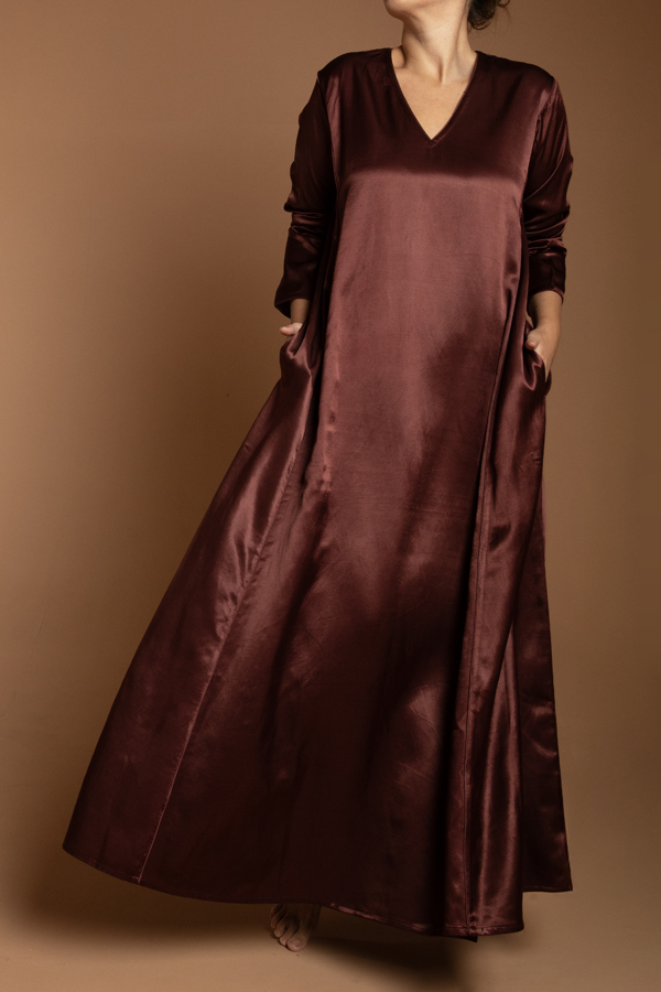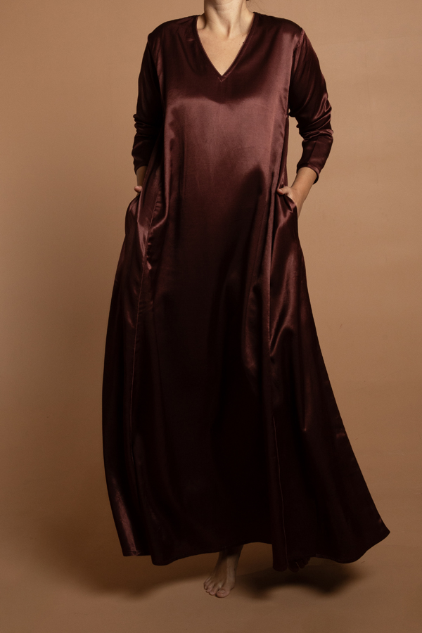 A deep red Gajji silk dress in our a-line maxi trapeze shape. Looks beautiful both loose with movement as well as belted with a cinched waist. Dry clean only. Made in Jaipur. Model is in a size M. Available in XS,S,M,L