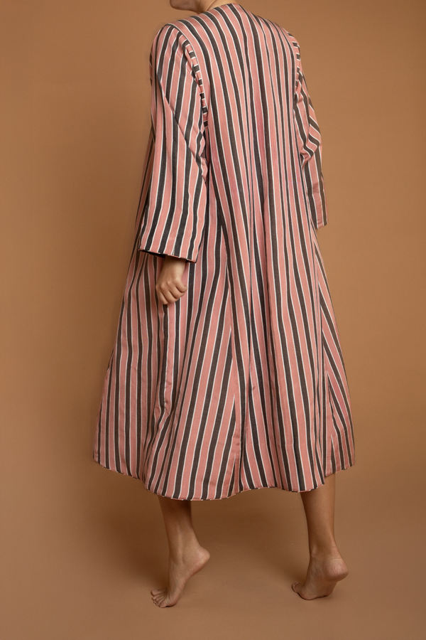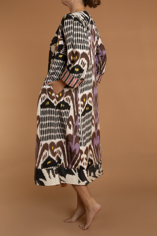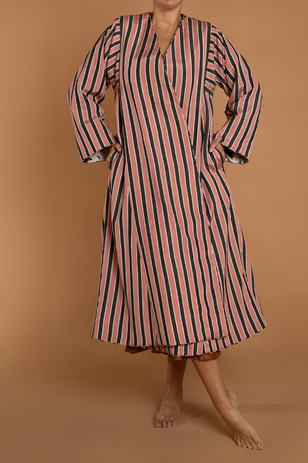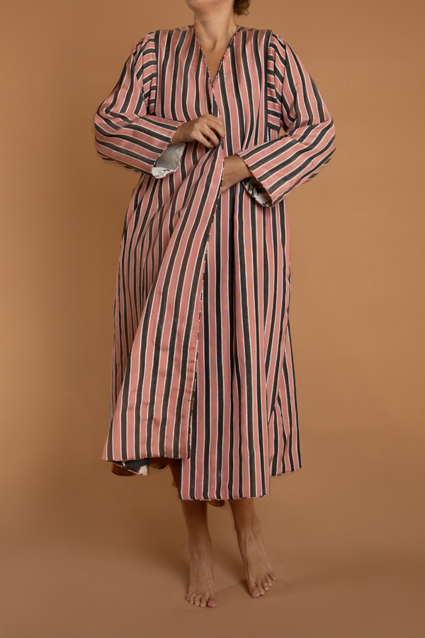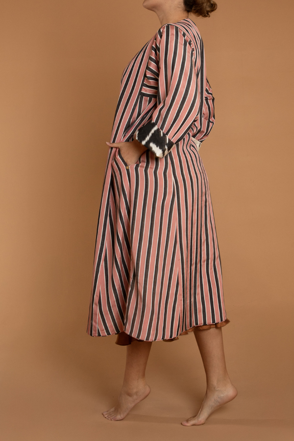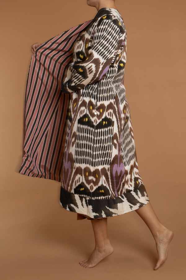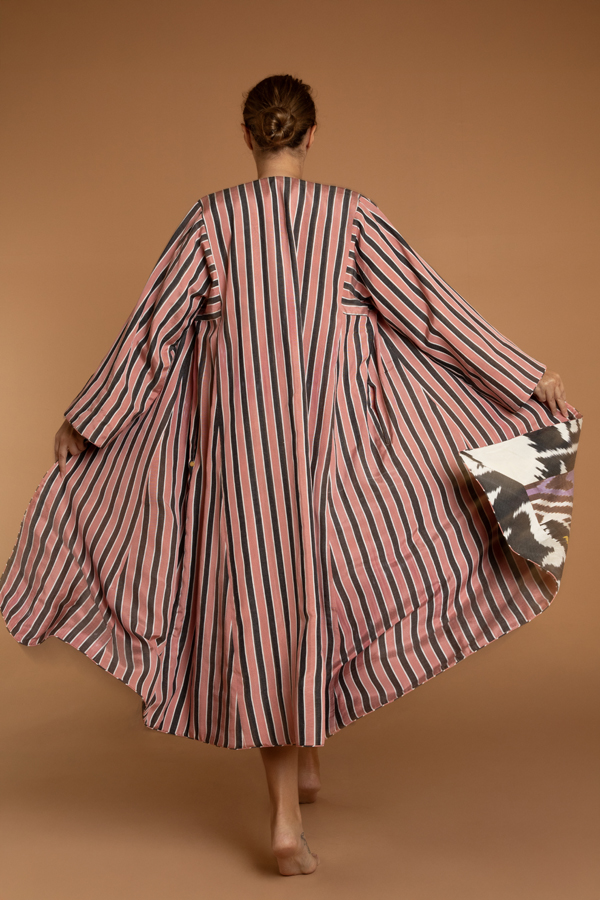 The coat for the print lover. A hand loomed midi length reversible coat. One side a vivacious heart print ikat and the other a pink and black stripe. Could be worn both ways, with pockets on either side. Ikat sourced from Uzbekistan and Turkey and coats tailored in Jaipur. Dry Clean only.