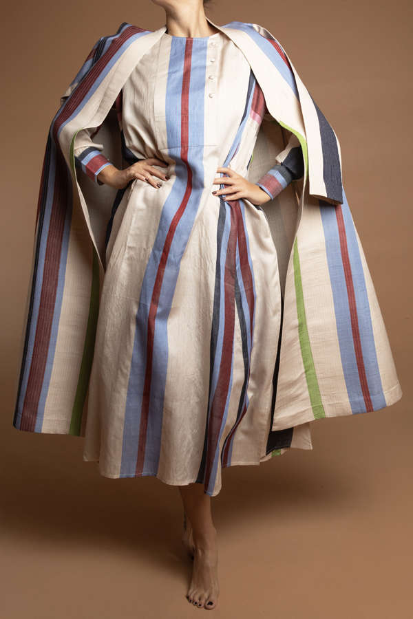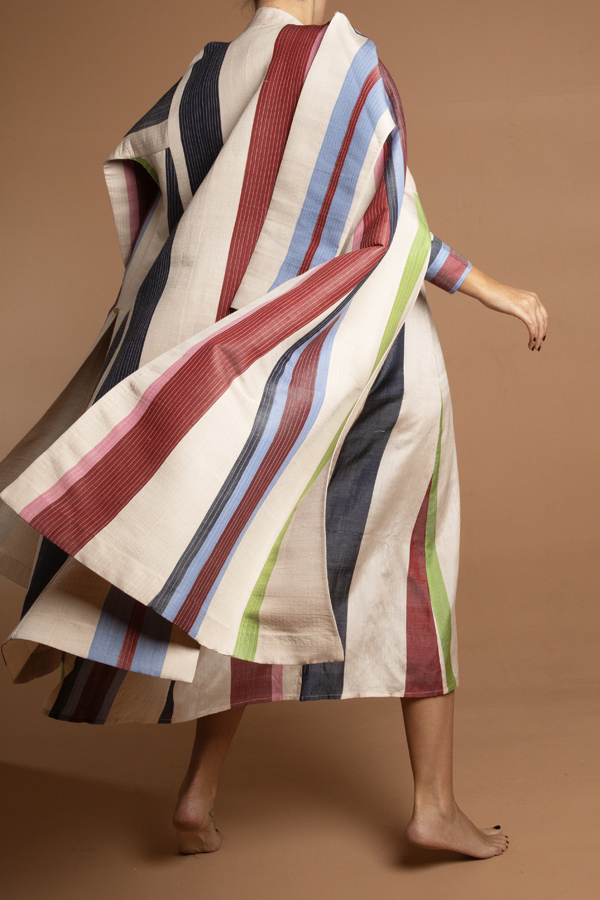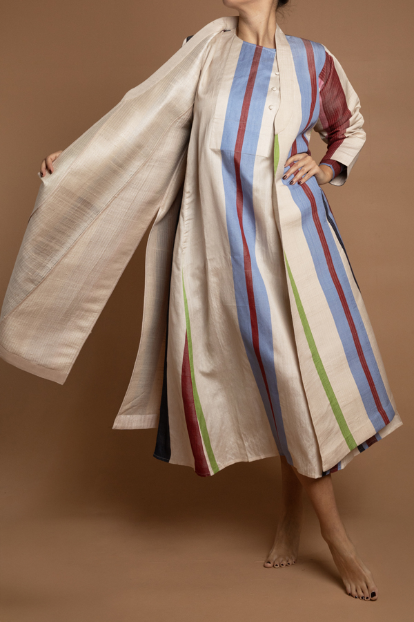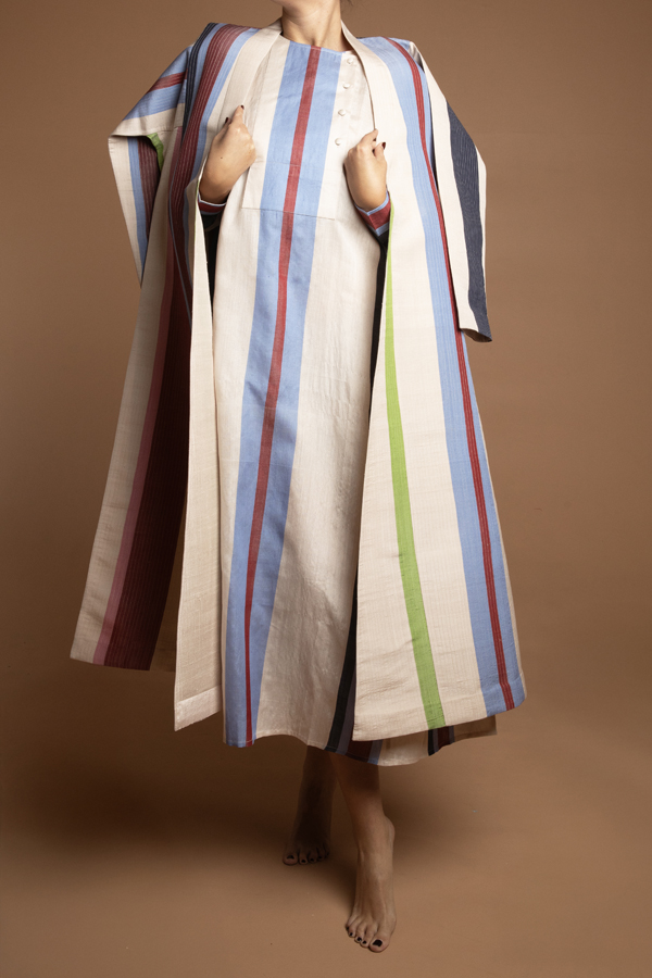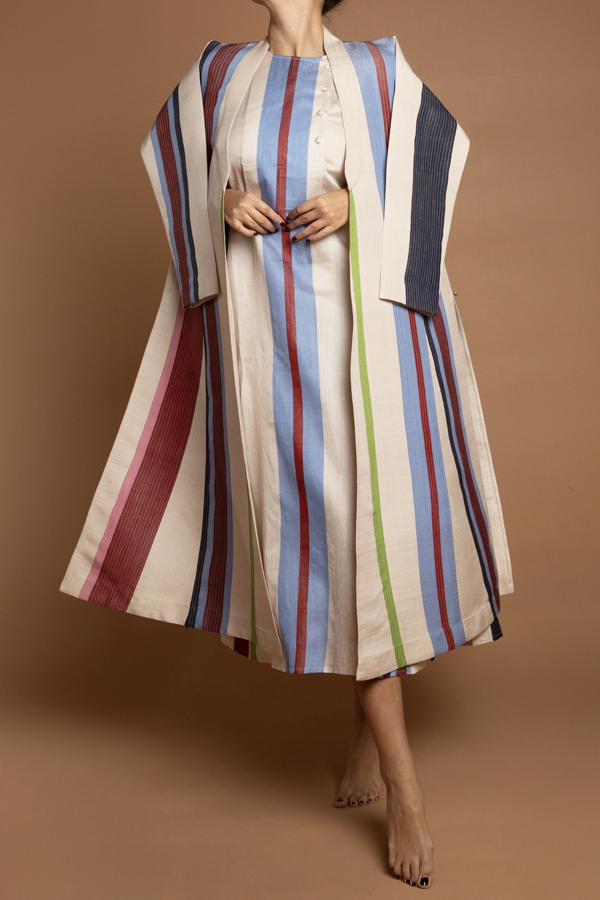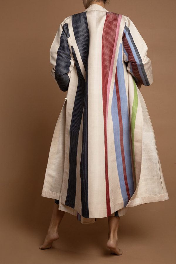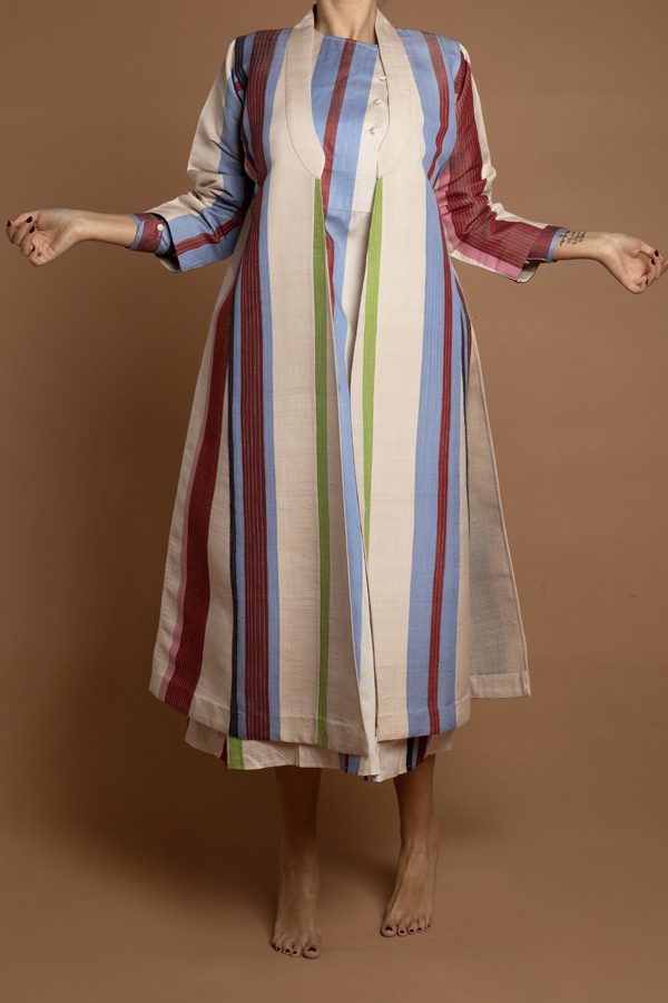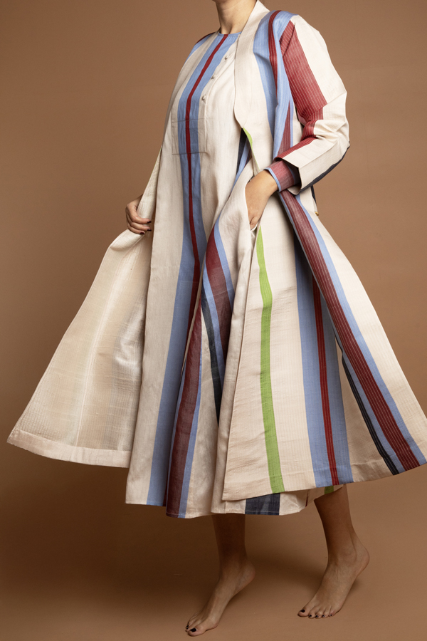 A quilted coat using a hand woven fabric made exclusively for ecru. Dry clean only. Made in Jaipur. Model is in a size M. Available in S,M,L