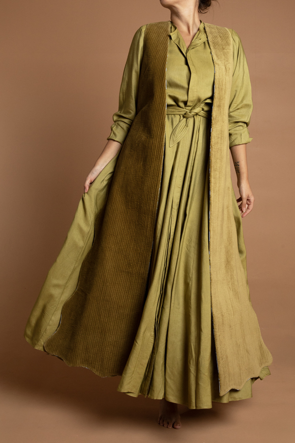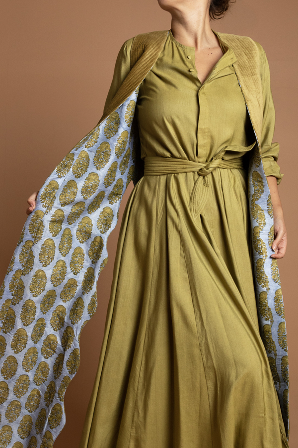 A quilted cotton velvet vest with wavy side slits. Lined in a hand block printed silk with a floral butti. Dry clean only. Made in Jaipur. Model is in a size M. Available in S,M,L