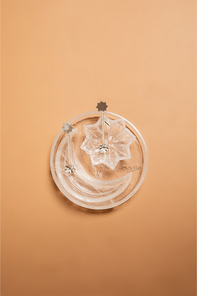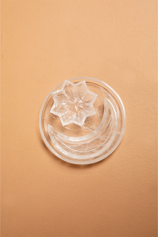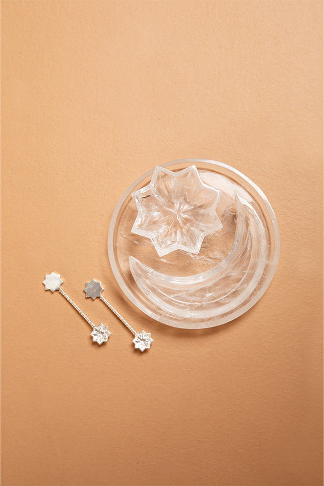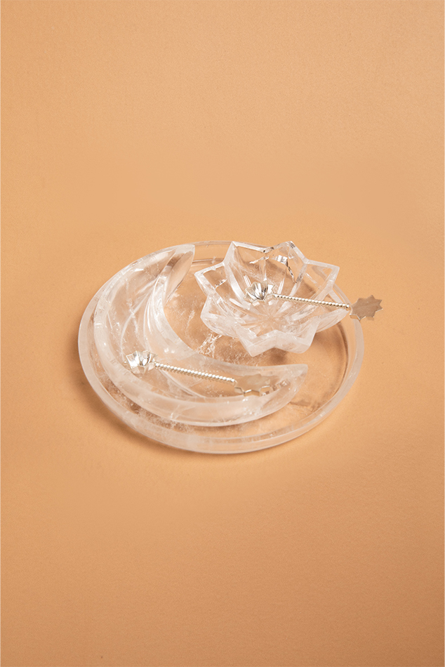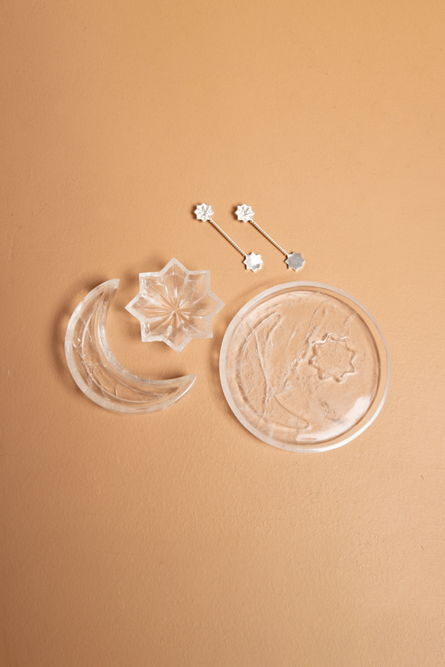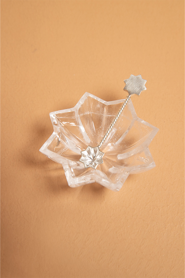 A magnificently precious set of a crescent moon and eight pointed star mini dishes on a corresponding platter. Sold with a set of two matching spoons. Hand carved out of rock crystal in Jaipur. Could be used as a salt and pepper pairing or any other mini condiments for serving. Could also be used as a mini trinket dish as well.