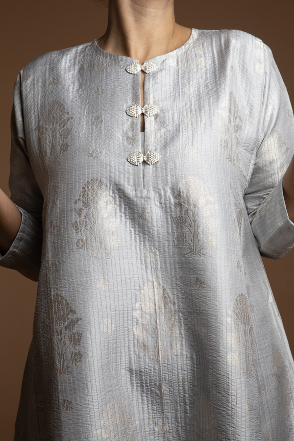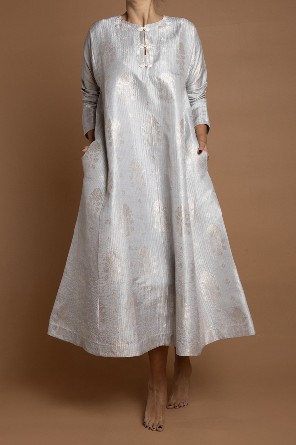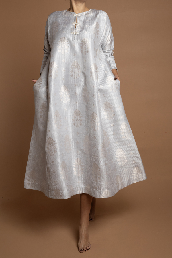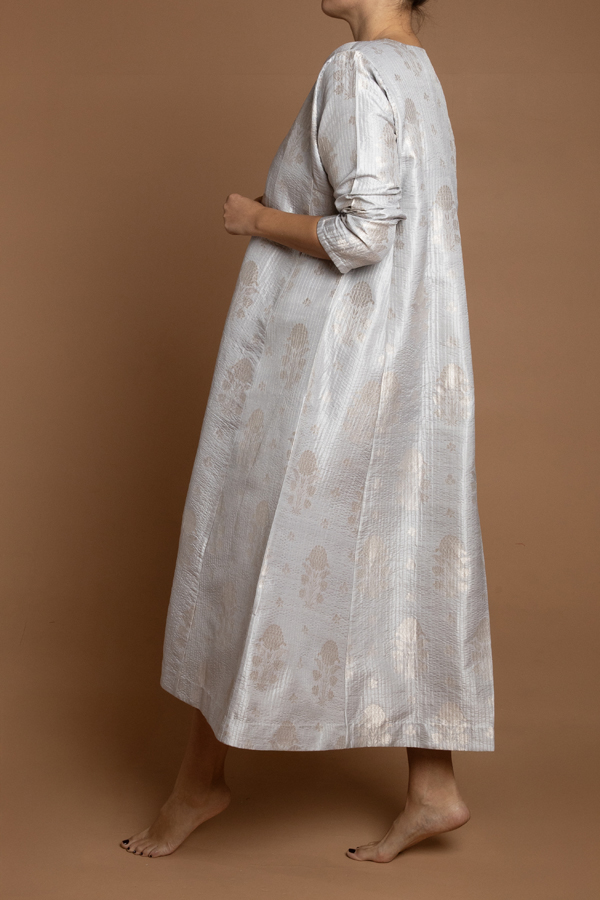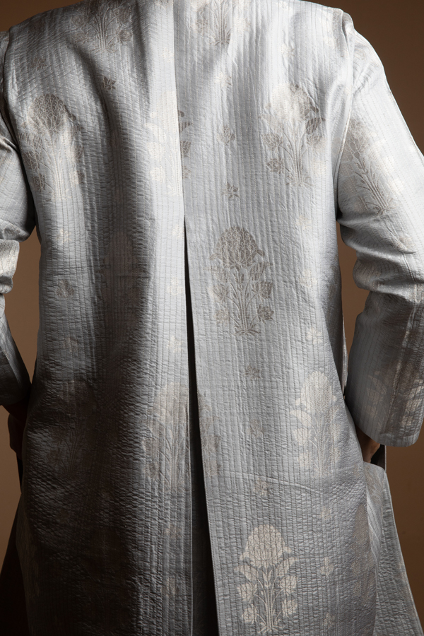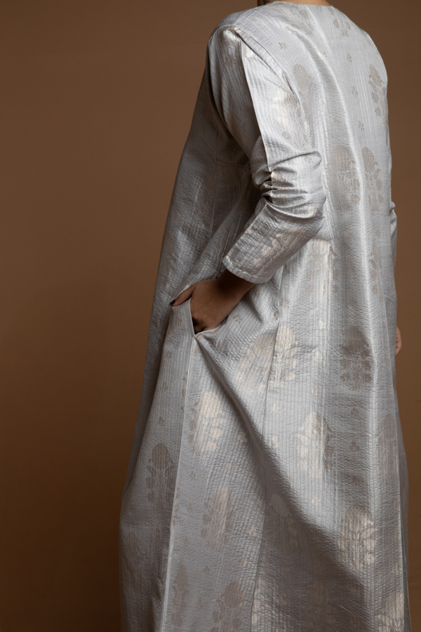 A hand woven brocade made exclusively for ecru in our most loved shape. This garment is entirely quilted using zari, a delicate metallic thread. Dry clean only. Made in Jaipur. Model is in a size M. Available in XS,S,M,L