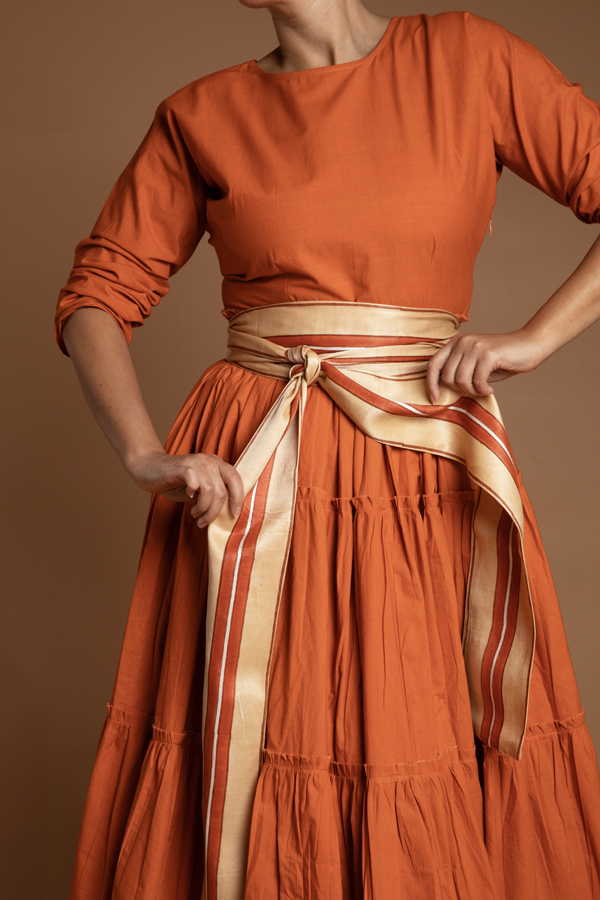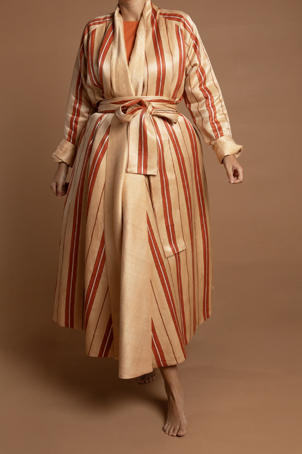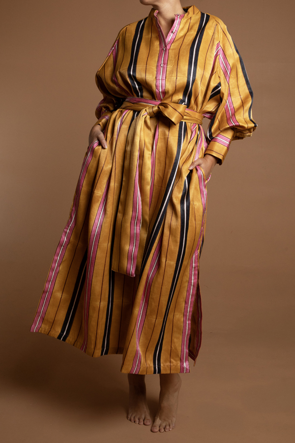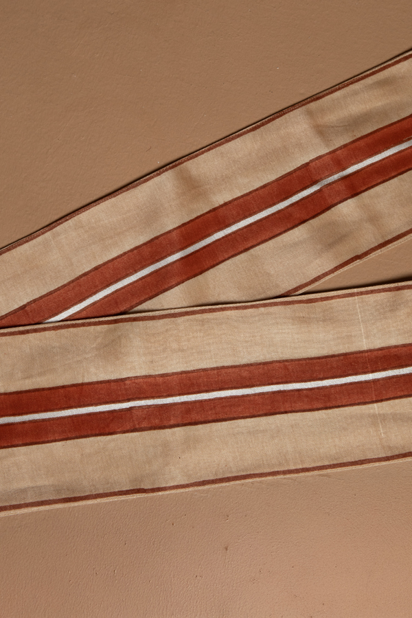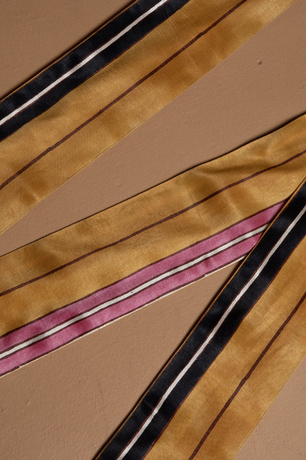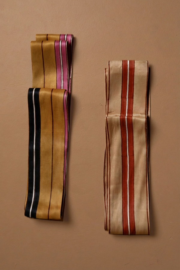 A Gajji silk sash in our Sultan Stripe and Vanilla Sultan Stripe made to be wrapped around the waist as a belt. Dry clean only. Made in Jaipur. Available in One Size