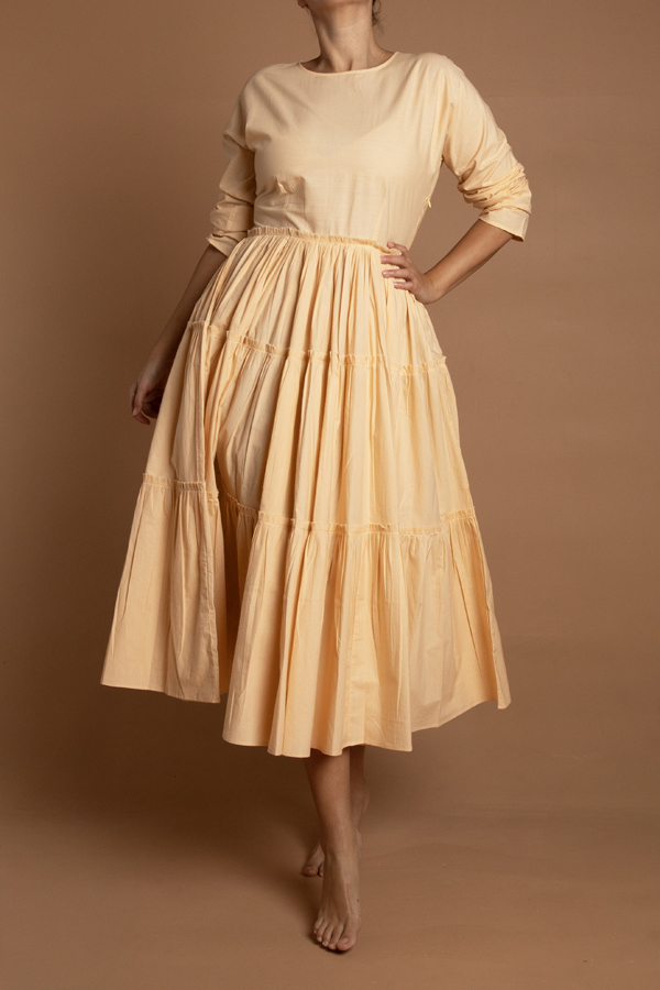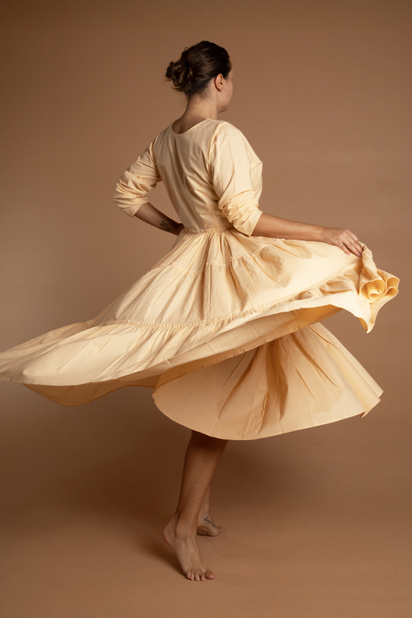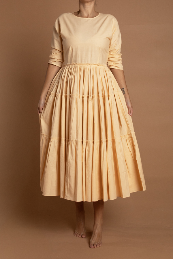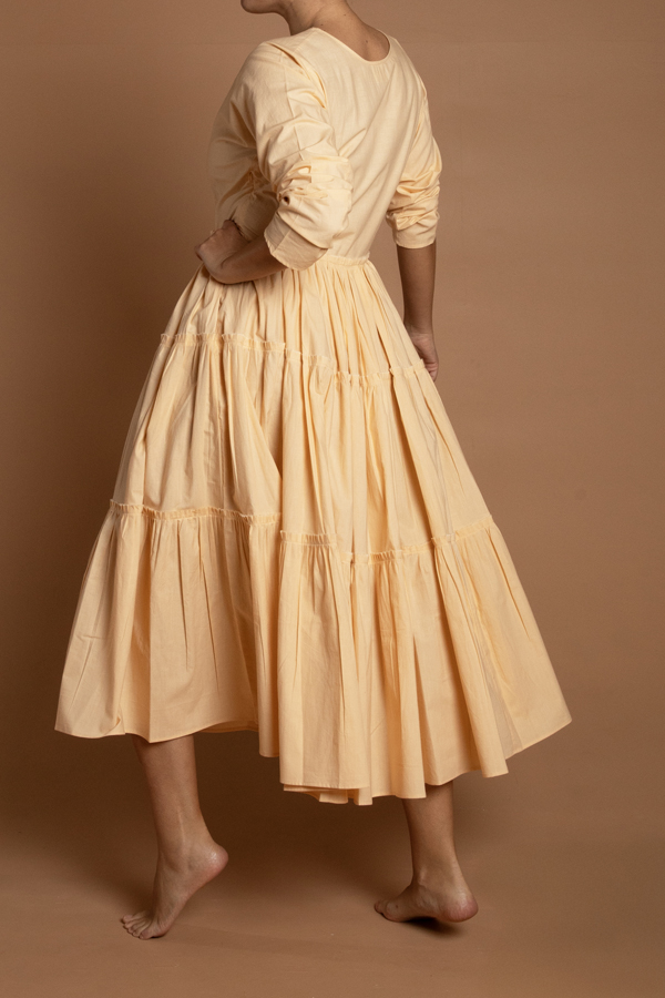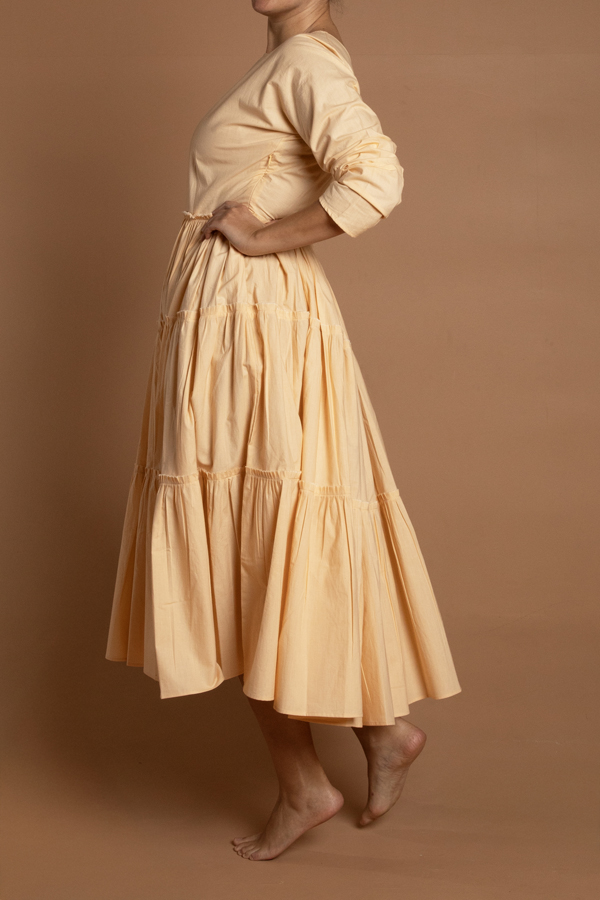 A tiered cotton dress with a side fastening. Makes for a perfect base under most coats. Delicate cycle in cold water. Made in Jaipur. Model is in a size S. Available in S,M,L